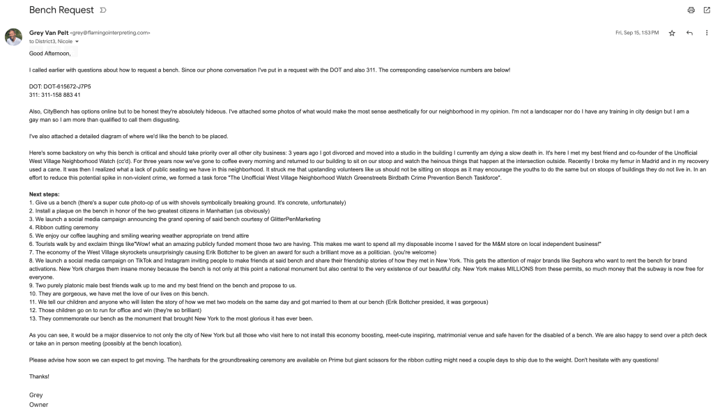 We plan to hold a Bench Warming Inaugural Seating with coffee for all of our neighbors to come, meet and celebrate what is arguably the best thing anyone has ever done in American history for The West Village. Follow us on Instagram for the details and tell Erik Bottcher when you see him in public, that you’re a New Yorker who supports The West Village Bench Project!